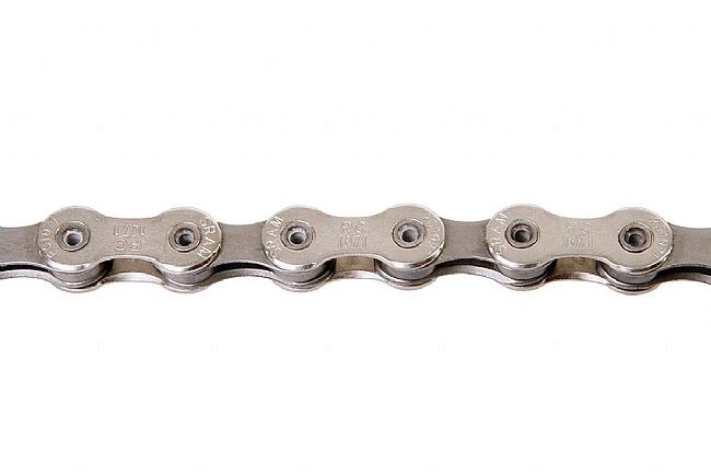 The SRAM PC-1071 chain features a slight re-shaping of the outer plates to run quieter than the previous PC-1070 chain. It has hollow pins to save weight without sacrificing strength. Nickel plating is used on the outer plates to resist corrosion. Includes tool-free PowerLock connector link. 259 grams (114 links).
