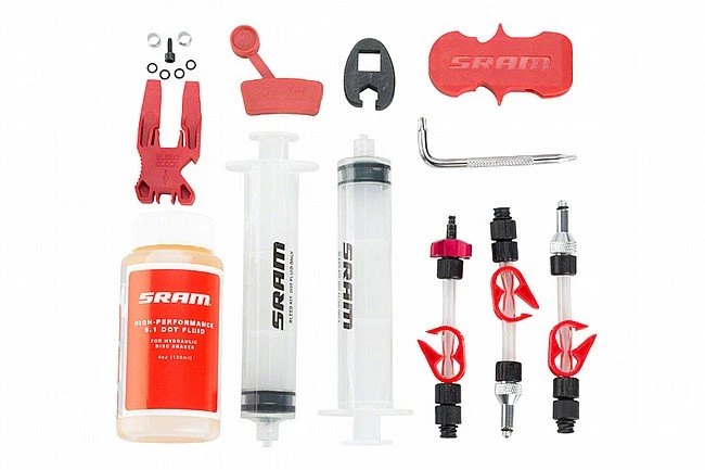 The SRAM Standard Disc Brake Bleed Kit contains the necessary tools and parts for executing a brake bleed on SRAM XX, XO, Elixir, Code, and Juicy series hydraulic (DOT fluid) brake models. The kit includes instructions, 2 Bleed Syringes, 2 Fitting/Clamp Tubes, 2 Barbed Tubing Inserts, 1 Torx-T25 L-wrench, 1 3/8″-drive 8mm crows-foot, bleed blocks, a bleeding edge fitting, and a 4oz container of DOT fluid.